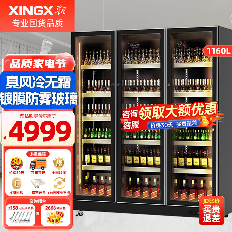 星星(XINGX)展示柜冷藏保鲜柜 风冷无霜双开门立式冰柜 冰箱啤酒饮料商用 高端网红酒水酒柜KTV酒吧便利店 三门1160升风冷无霜LOWE防雾玻璃价格:4999.00元!