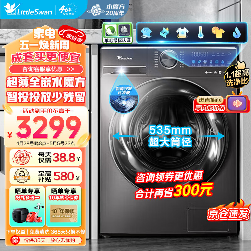 小天鹅(LittleSwan)小乌梅洗衣机滚筒10公斤全自动水魔方智能投放1.1高洗净比超薄全嵌旗舰羊毛绿标轻享版M18T价格:3299.00元!