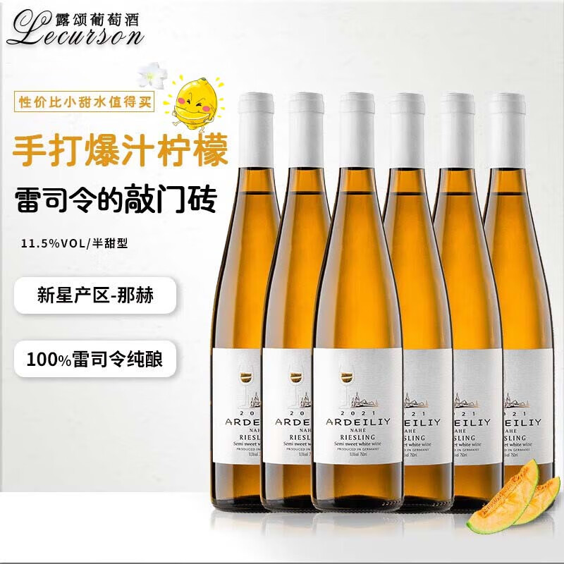 露颂【100%雷司令】德国进口雷司令半甜白葡萄酒原酒进口 配2香槟杯 雷司令半甜白6支装(无杯)价格:340.00元!