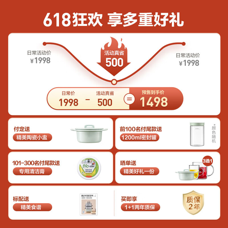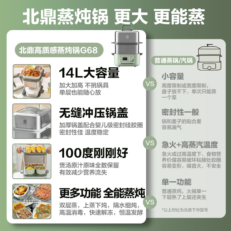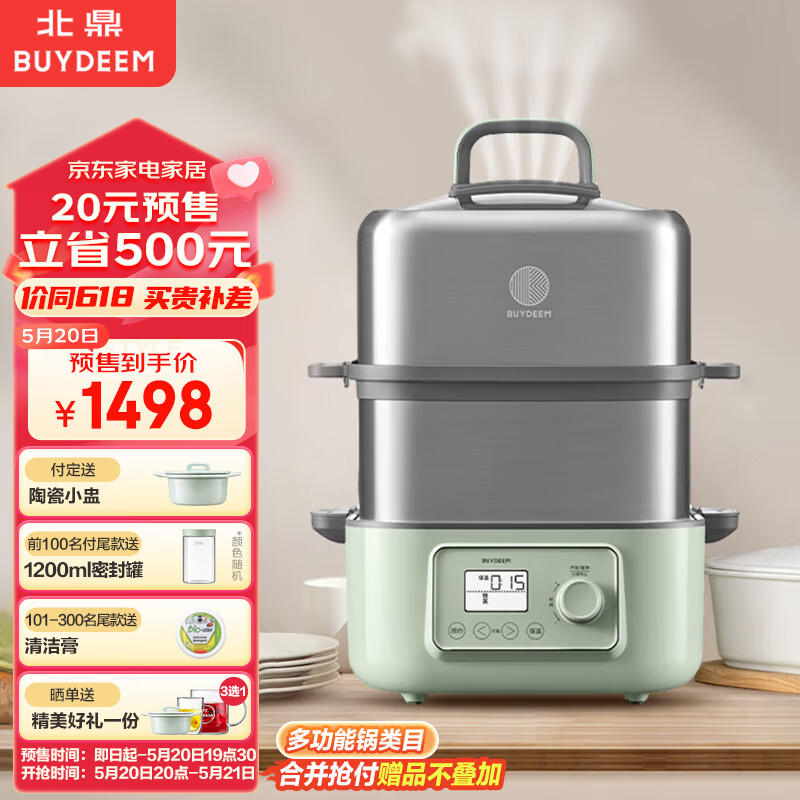 北鼎(Buydeem)蒸炖锅家用电蒸锅全自动预约家用多用途锅多功能多层【浅杉绿G68】(含二层蒸架)价格:1498.00元!
