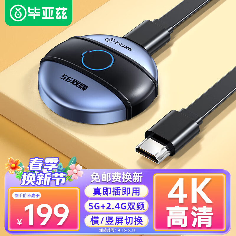 毕亚兹 无线投屏器 4K高清视频传输同屏器 适用手机苹果华为安卓手机转换接电视显示器投影仪价格:199.00元!