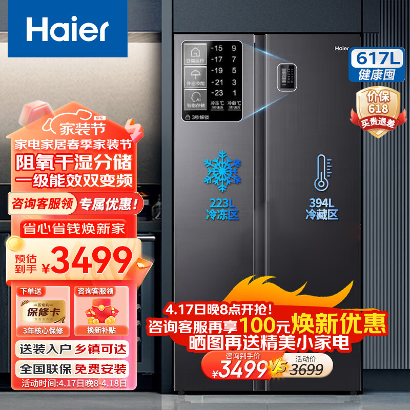 海尔(Haier)冰箱617升对开门一级能效变频风冷无霜黑金净化家用大容量电冰箱BCD-617WGHSSE5S9价格:3899.00元!