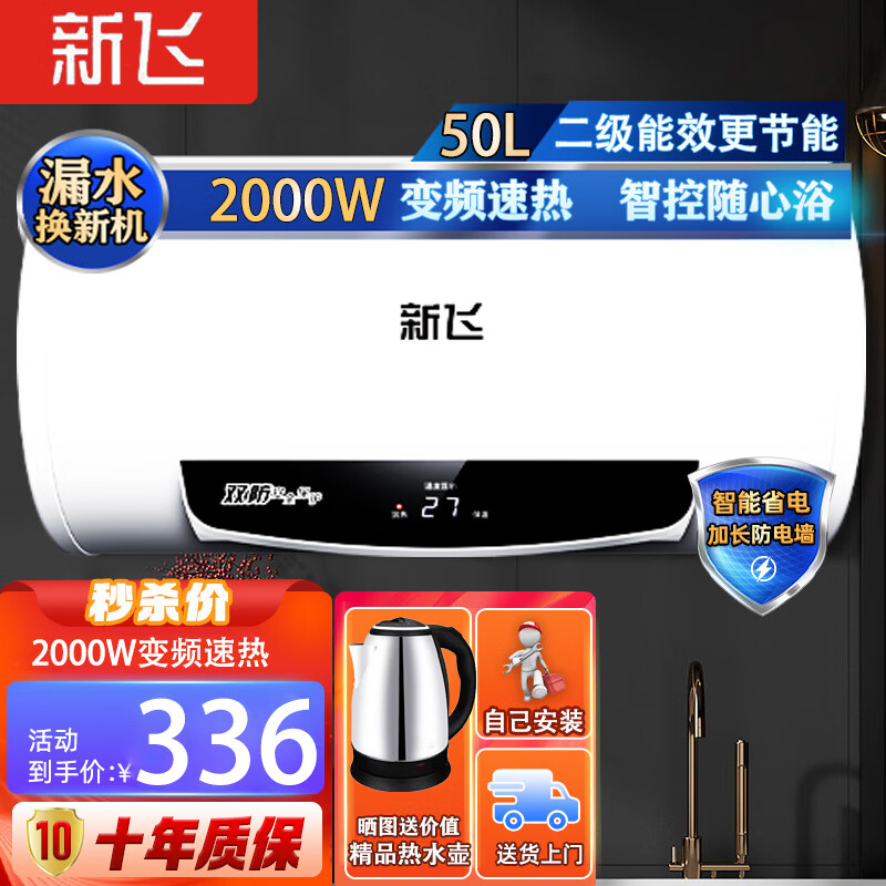 新飞热水器2000W速热节能省电50升储水式耐用漏电预警电热水器二级能效 双防电墙 DSZF-Y50H价格:336.00元!