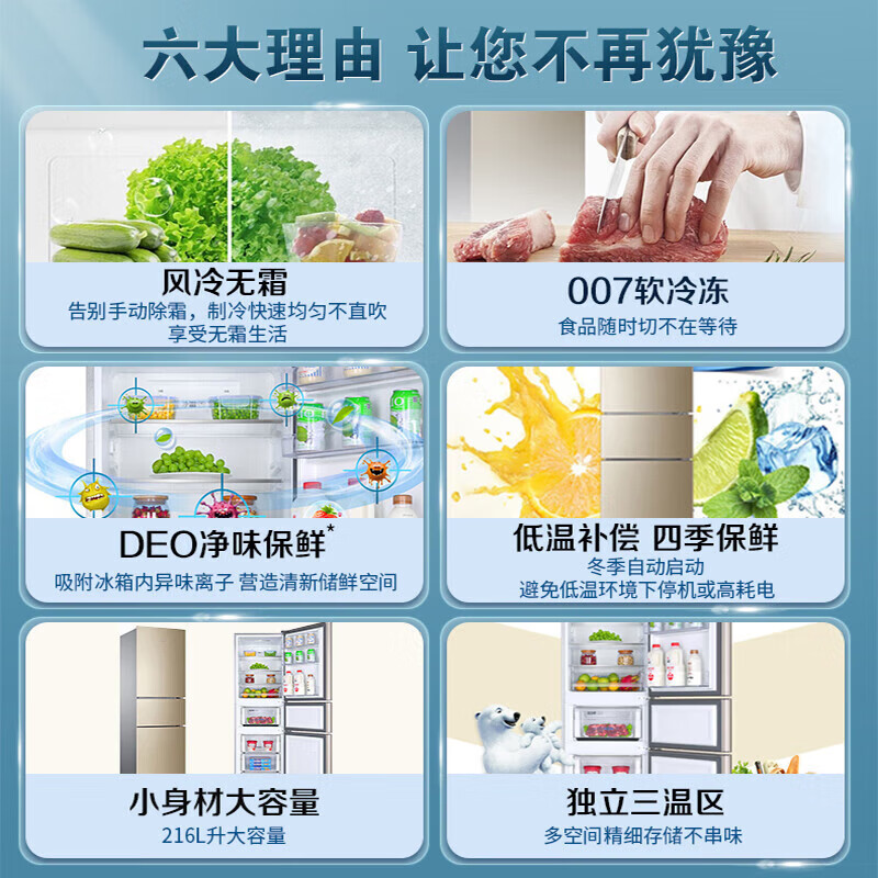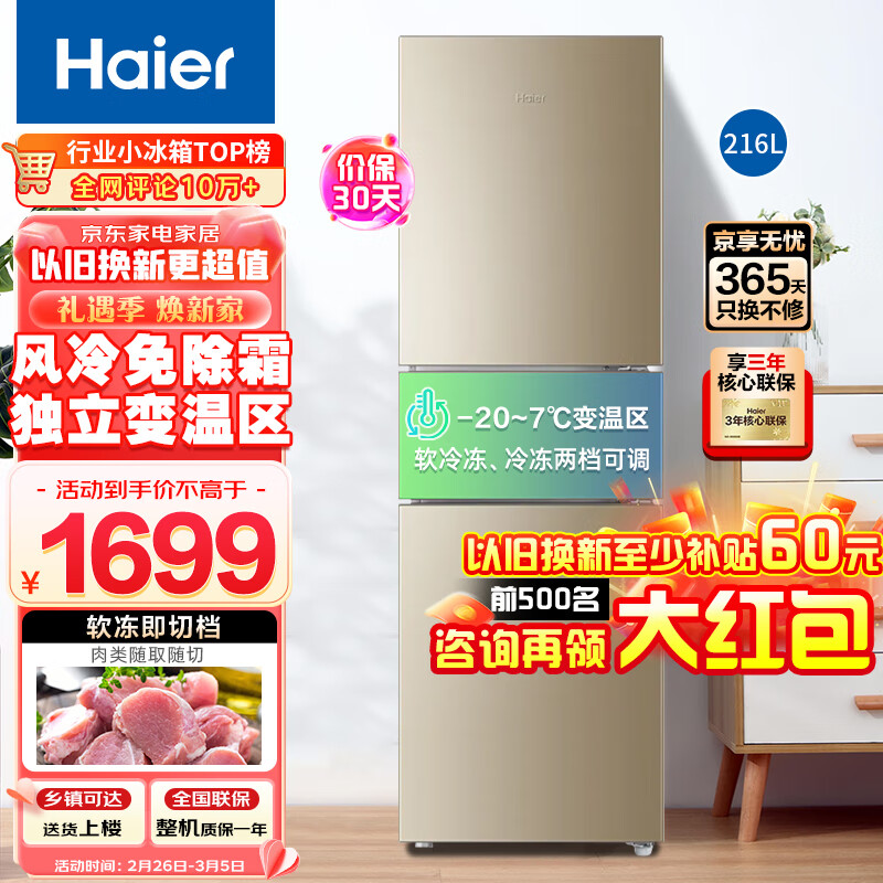 海尔(Haier)216升冰箱风冷无霜家用中小型宿舍出租房三门三温区软冷冻节能高性价比电冰箱价格:1699.00元!