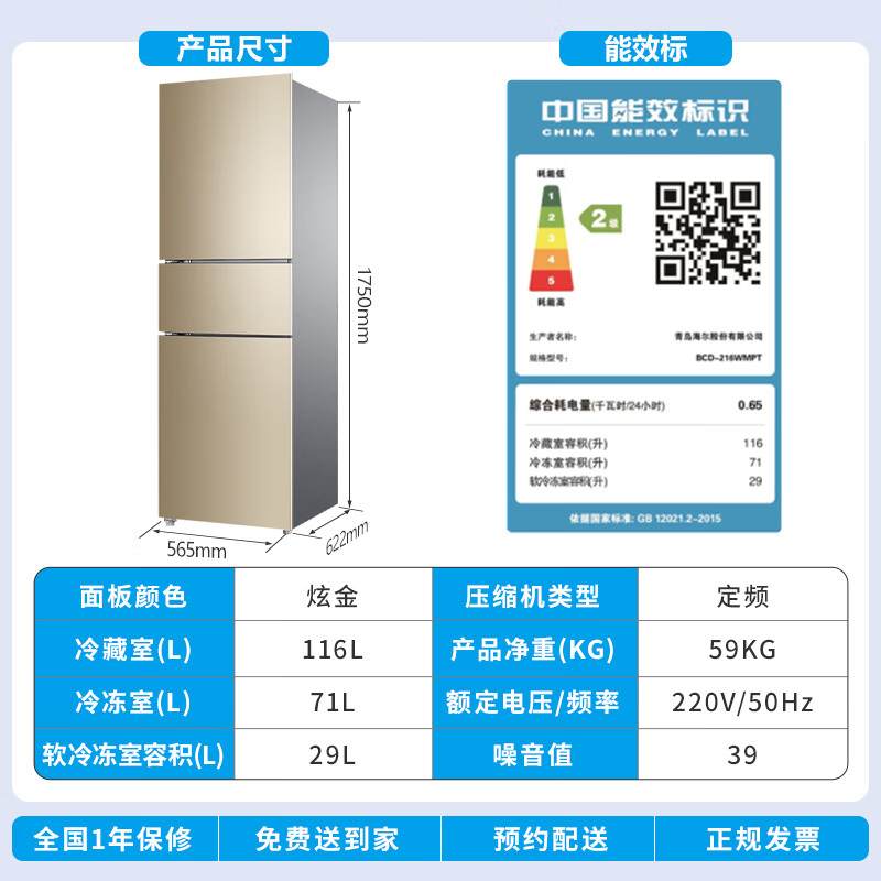 海尔BCD-216WMPT配置参数: