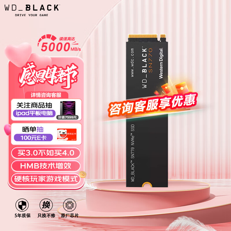 西部数据(WD)500G SSD固态硬盘 M.2接口 SN770 PCIe4.0 2280(NVMe协议)AI电脑配件 笔记本电脑游戏硬盘价格:527.00元!