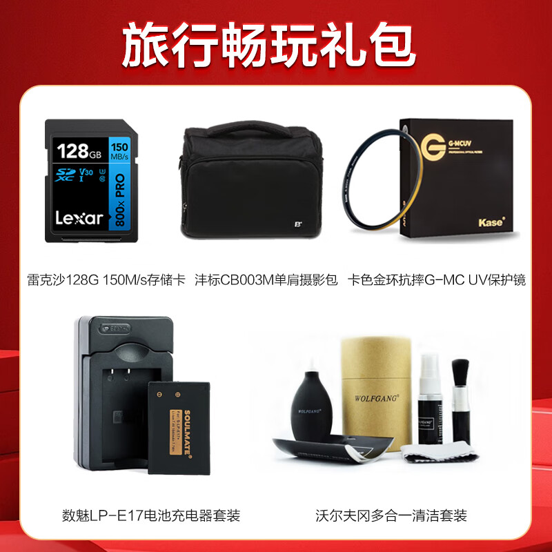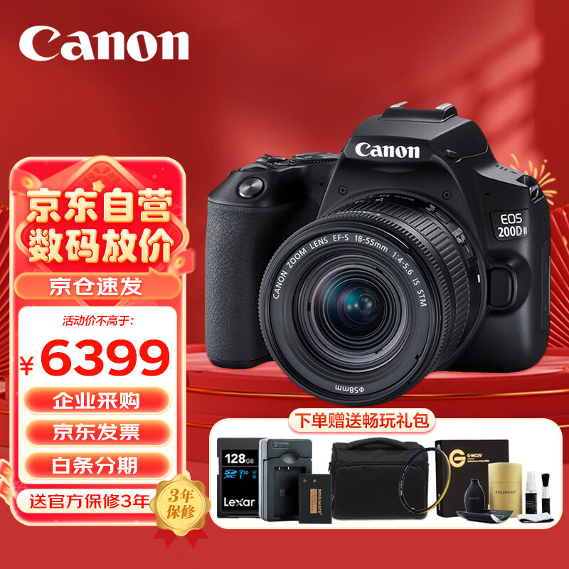 佳能(Canon)EOS 200D2 II 二代 单反相机 4K Vlog视频 家用便携高清美颜照相机 18-55mm标准变焦 旅行畅玩套装价格:6399.00元!