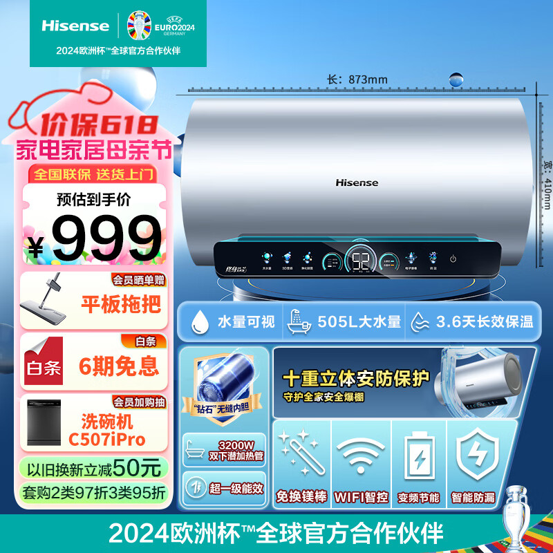 海信(Hisense)60升家用电热水器3200W变频速热一级能效镁棒免更换钻石无缝内胆大屏WIFI智能C509i智享以旧换新价格:999.00元!