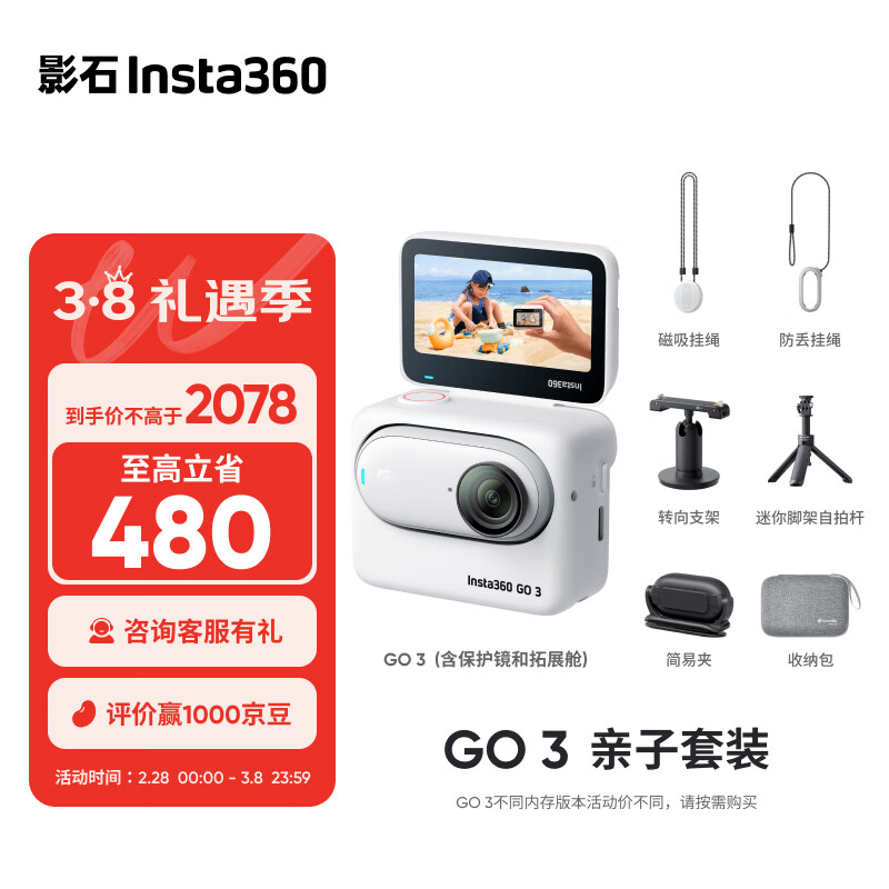 Insta360影石 GO 3拇指相机 运动亲子Vlog骑行宠物防水防抖运动相机(亲子套装 灵动白32G版)价格:2078.00元!