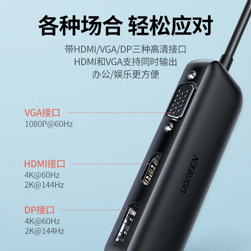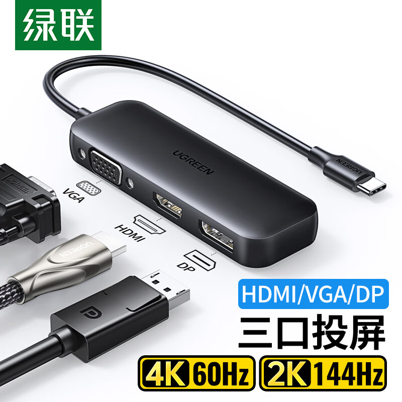 绿联Type-C转HDMI/DP/VGA投影仪转接头三合一视频显示投屏转换器线USB-C扩展适用苹果15笔记本电脑手机价格:129.00元!
