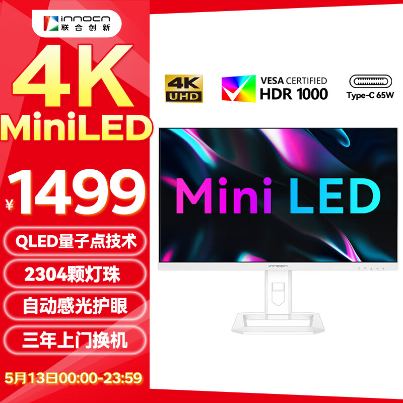 联合创新(INNOCN)27英寸4K MiniLED显示器 QD量子点HDR1000 Type-C65W旋转升降 设计办公电脑显示屏27M2U-D价格:1699.00元!