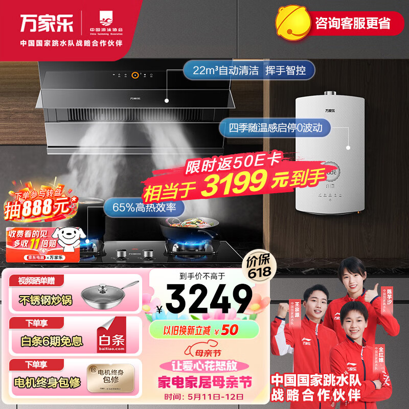 万家乐烟灶热厨卫三件套 22立方烟灶套装 16L变频水伺服燃气热水器套装AL061+KV061B+16DS8天然气价格:3449.00元!
