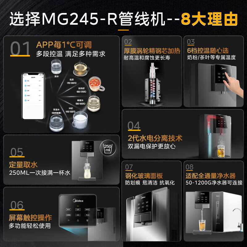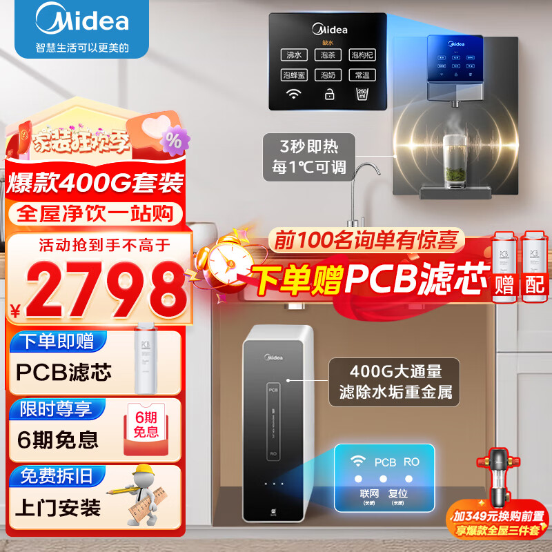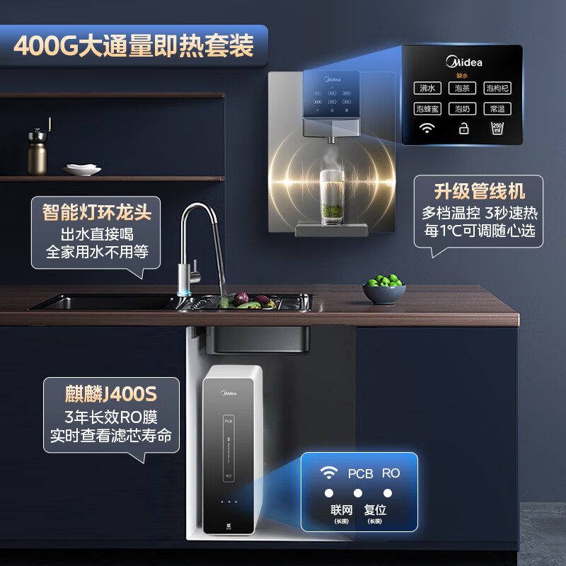 美的(Midea)净水器家用净水机厨下式全屋母婴直饮机麒麟400G加热直饮一体机RO反渗透过滤器大通量金豆纯水机 【麒麟J400G+245管线机】套装价格:2998.00元!