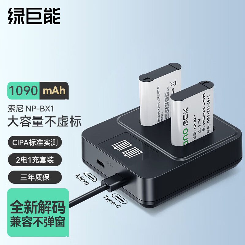 绿巨能(llano)索尼NP-BX1电池ZV-1M2相机电池充电器黑卡RX100M7/M6/M5/RX1R/PJ410/AS30单反数码电池两电一充价格:109.00元!