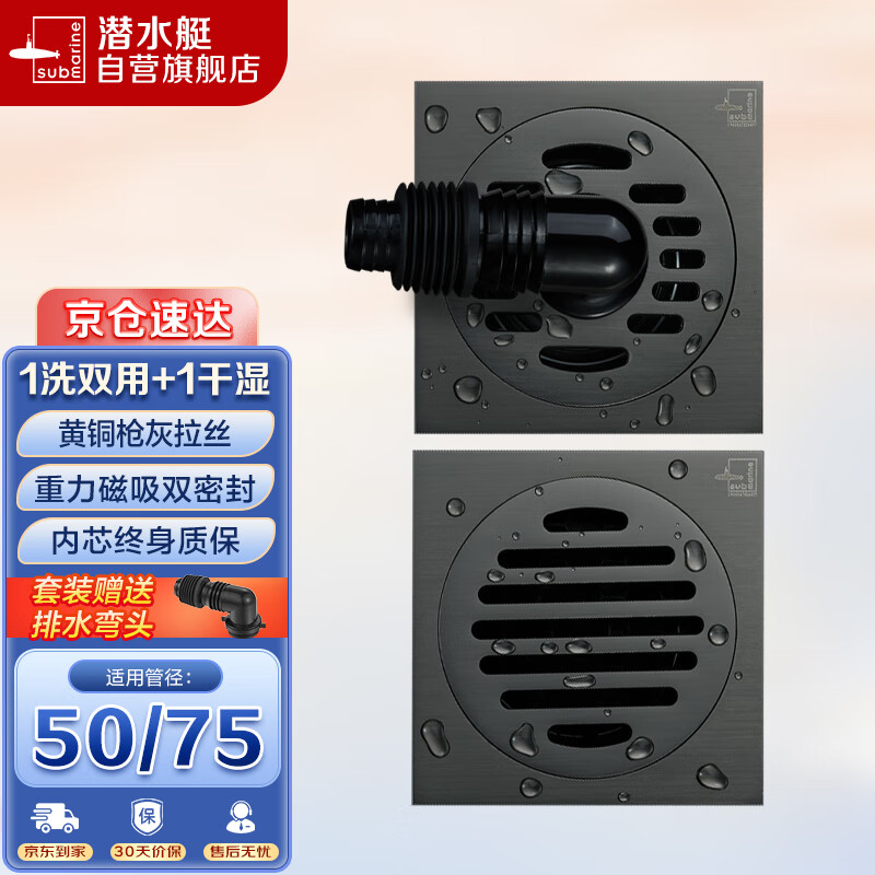潜水艇(Submarine)黄铜镀镍枪灰色拉丝面50管防臭地漏套装 干湿区通用+洗衣机价格:221.00元!