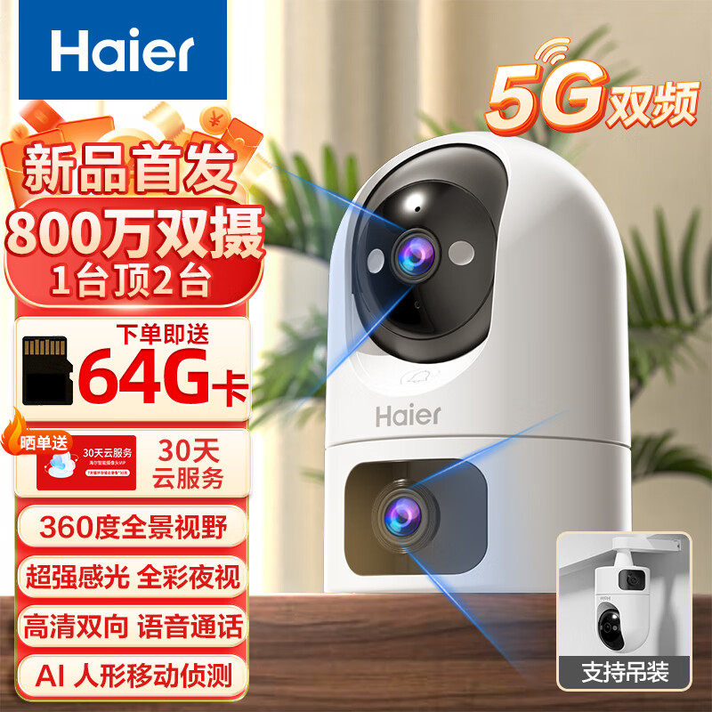 海尔(Haier)800万双摄家用摄像头手机无线远程监控器360度无死角带夜视全景语音自动旋转可对话室内外云台价格:229.00元!