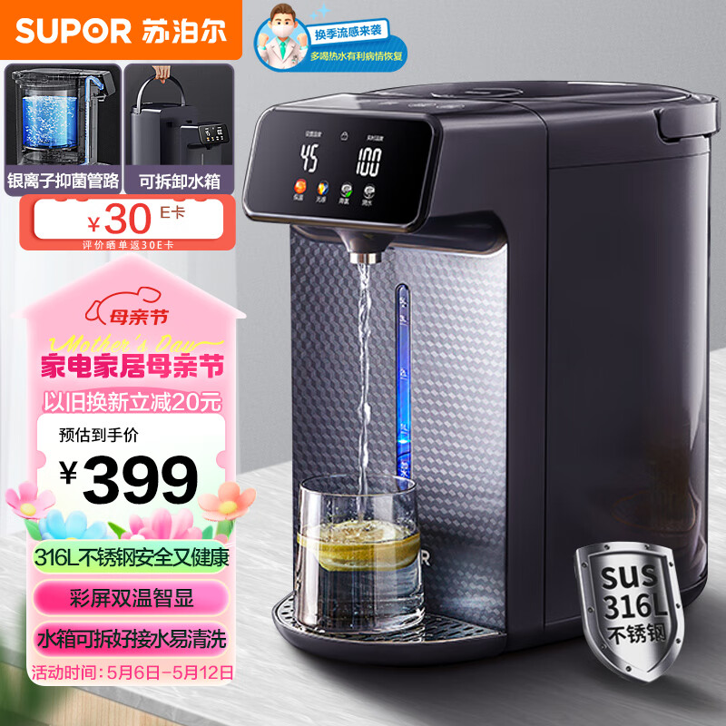 苏泊尔(SUPOR)电热水瓶 双层电热水壶烧水壶 5L大容量316L不锈钢电水瓶 多段保温恒温电水壶 SW-50T188价格:399.00元!