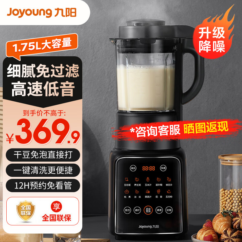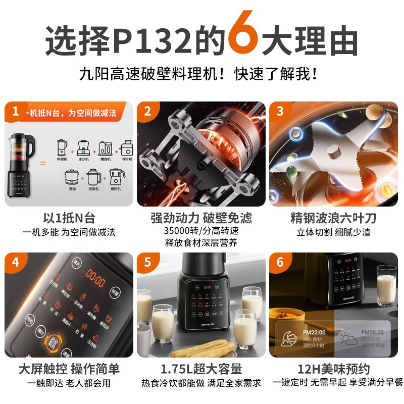 九阳破壁机家用免滤豆浆机1.75L大容量全自动免煮五谷杂粮机加热高转速榨汁机静音多功能料理机 P132价格:369.90元!