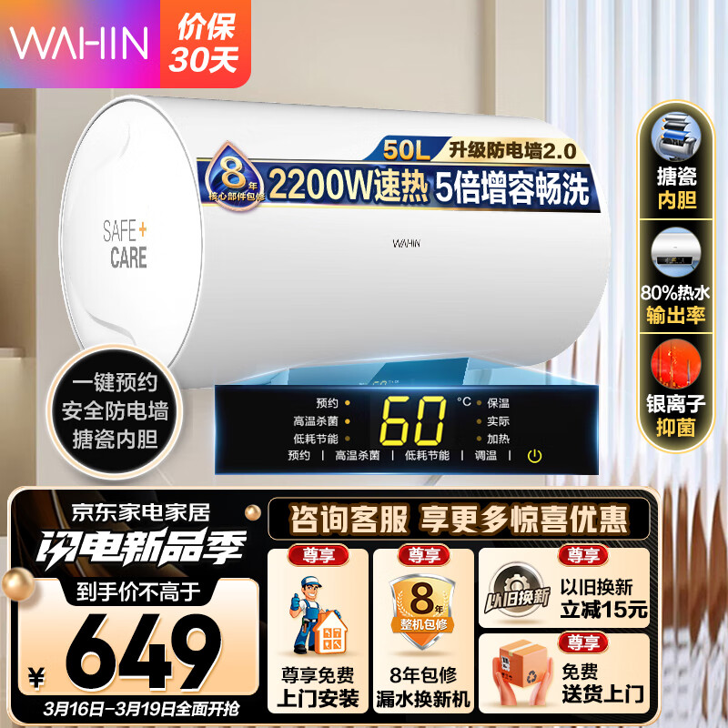 美的(Midea)出品50升家用电热水器储水式速热2200W大水量防电墙低耗节能上门安装以旧换新 华凌F5021-YJ2(HY)价格:649.00元!