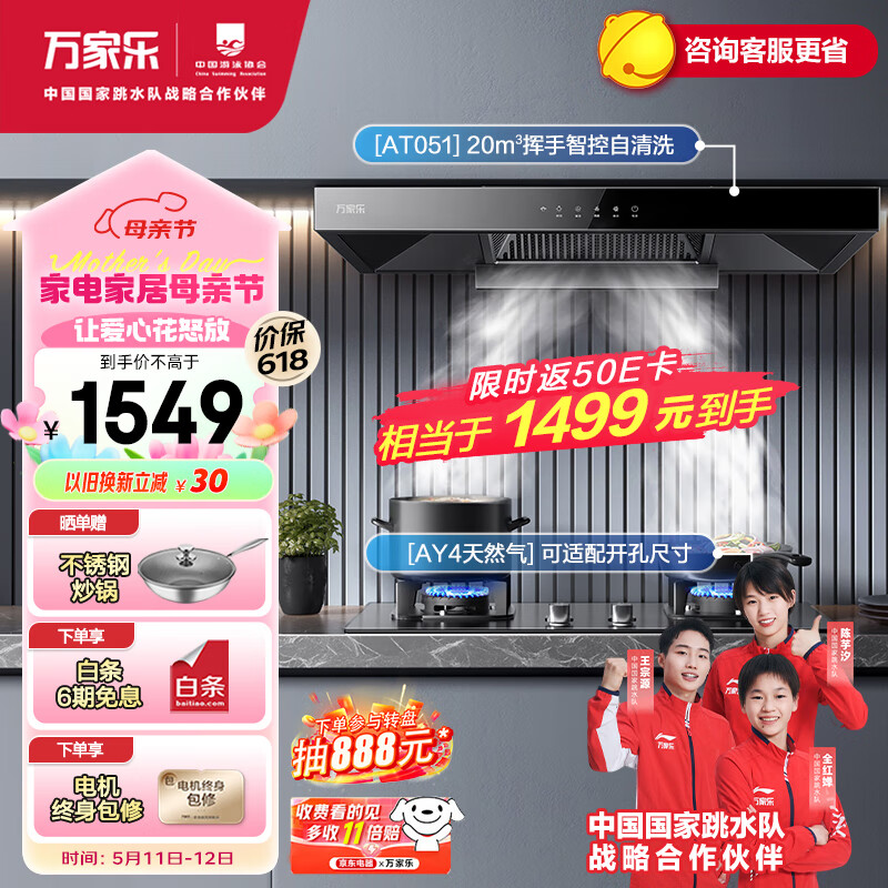 万家乐 抽油烟机 欧式自清洗烟灶套装20m3/min挥手感应油烟机5.0kW高温防烫燃气灶具套装AT051+AY4天然气价格:1749.00元!