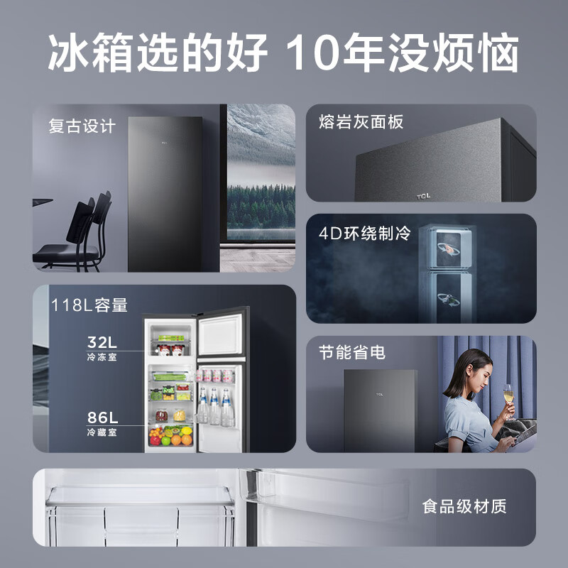 TCL 118升迷你复古冰箱单门双温节能低噪租房电冰箱迷你小型租房节能办公室冰箱R118L1-A熔岩灰价格:799.00元!