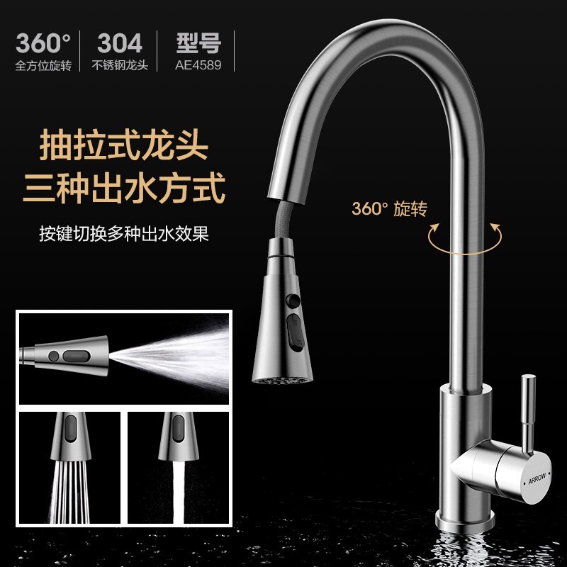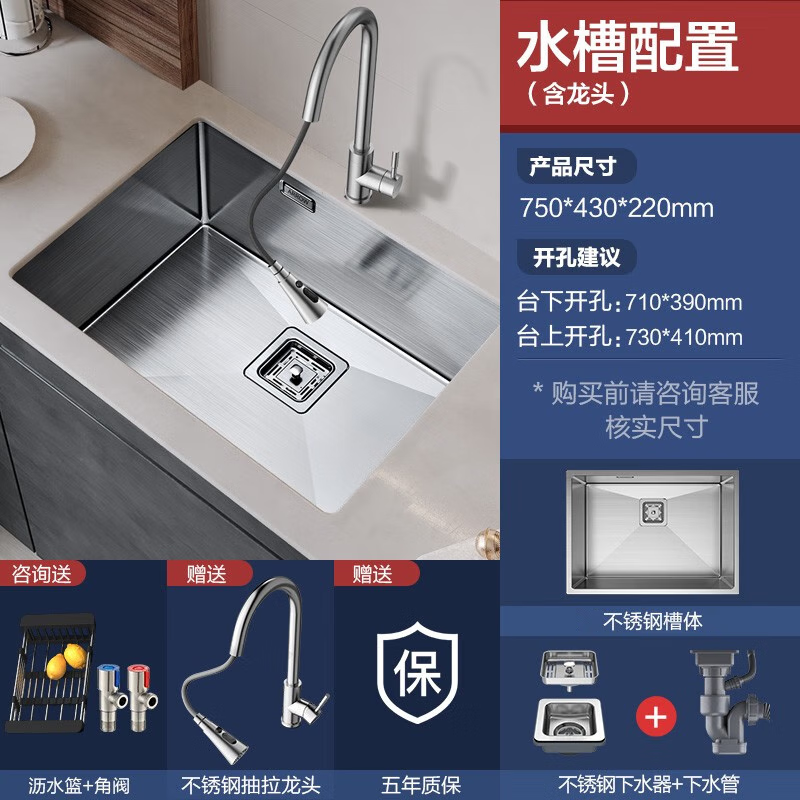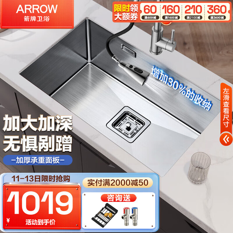 箭牌(ARROW) 304不锈钢厨房手工水槽大单槽洗菜盆洗碗池盆茶水间台上台下盆 75*43窄边手工槽+冷热抽拉龙头价格:1219.00元!