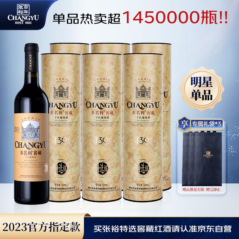 张裕 特选级窖藏赤霞珠干红葡萄酒750ml*6瓶整箱圆筒装国产红酒送礼价格:238.00元!
