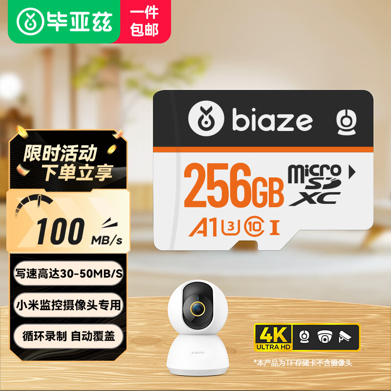 毕亚兹(BIAZE)256GB TF(Micro SD)存储卡 小米家庭监控专用内存卡 高度耐用 稳定读写价格:129.00元!