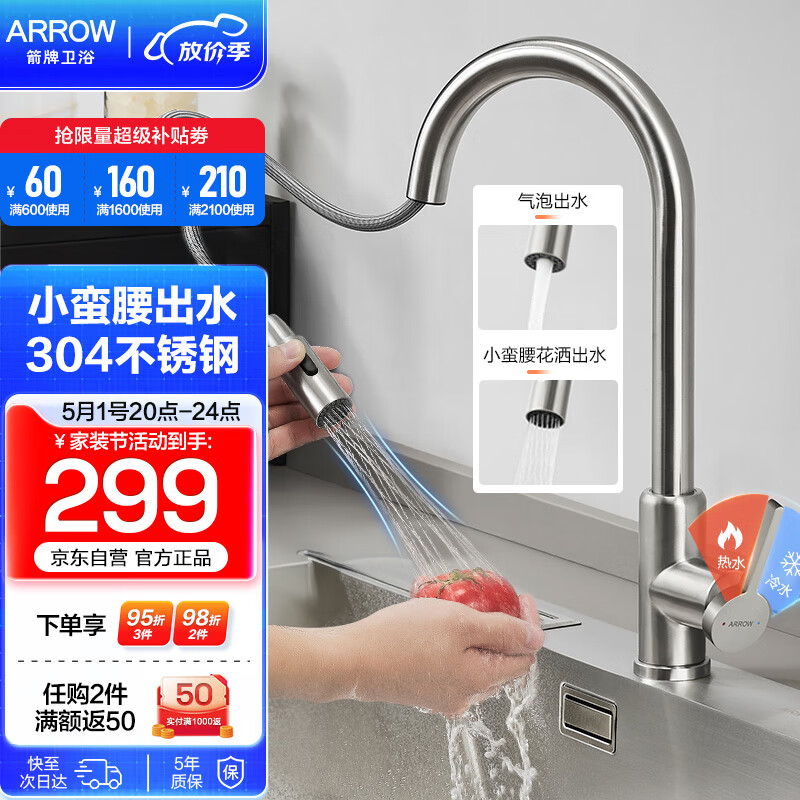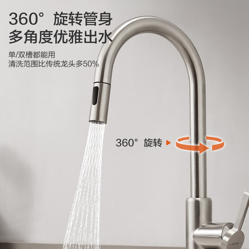 箭牌(ARROW) 厨房304不锈钢厨房龙头冷热抽拉式龙头洗碗盆洗菜盆 【热款】小蛮腰出水抽拉龙头4551价格:299.00元!