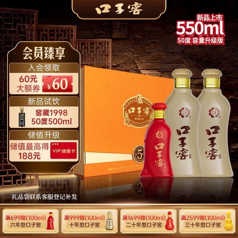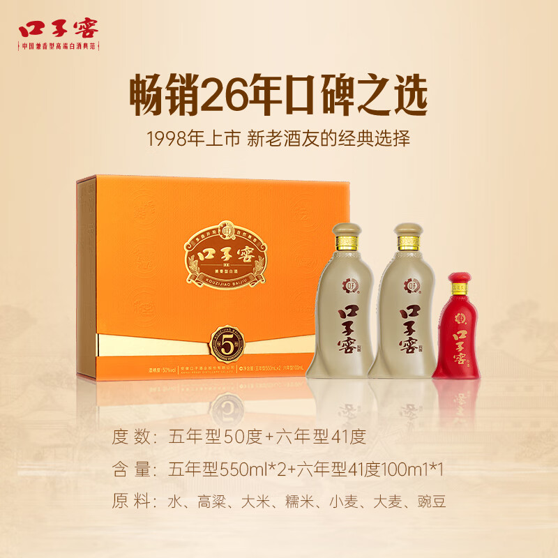 口子窖 五年型 兼香型白酒 50度 550ml*2瓶礼盒装 送礼宴请价格:292.00元!