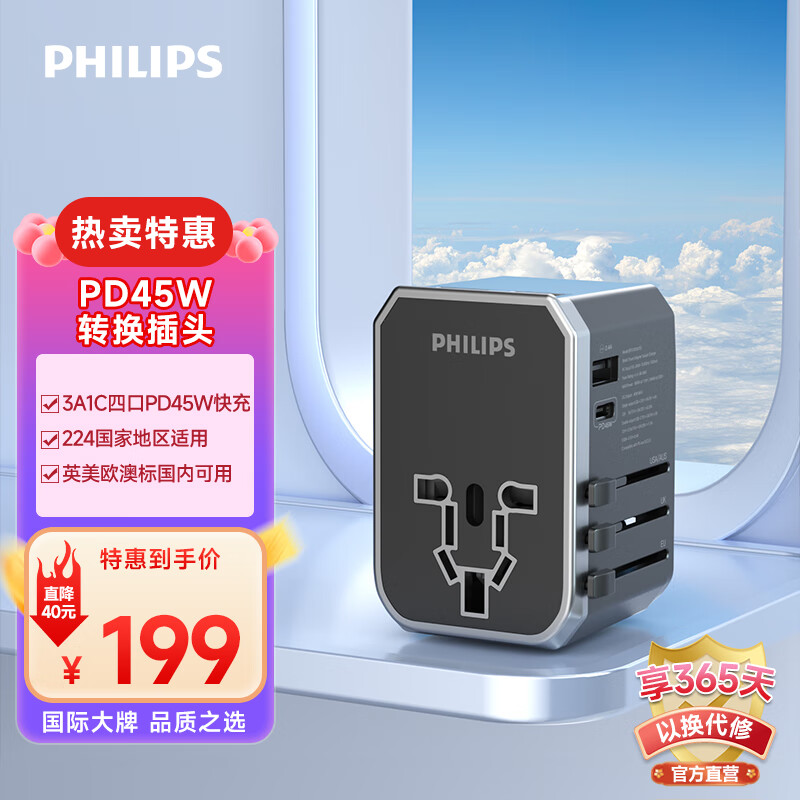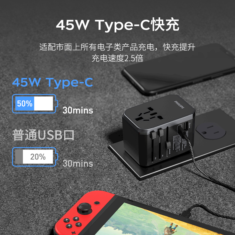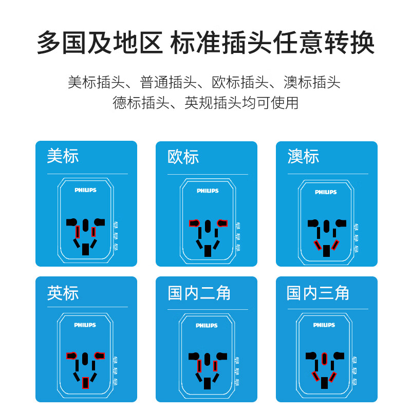 飞利浦(PHILIPS)出国转换插头/多国通用旅行插座转换器/英欧美澳德国日本韩国新加坡香港适用45wPD快充1003A价格:199.00元!