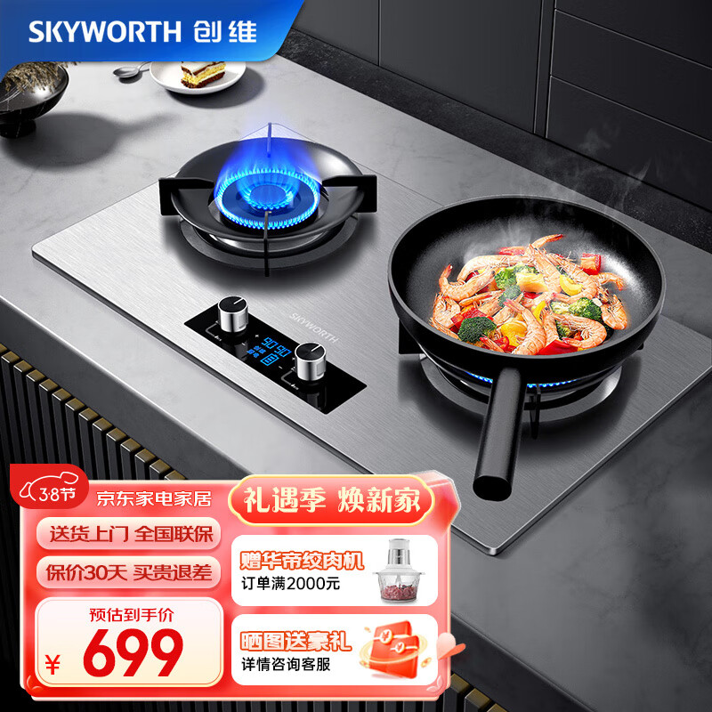 创维(Skyworth)燃气灶双灶具 家用5.2kW猛火灶智能定时关火 台式嵌入式两用不锈钢灶台防爆面板Z210(天然气)价格:699.00元!