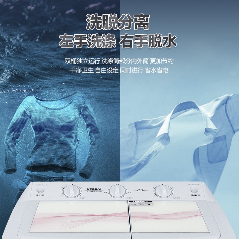 康佳(KONKA)8公斤 半自动波轮洗衣机 大容量 双桶双缸 脱水甩干机 家电(白色)XPB80-752S价格:468.00元!