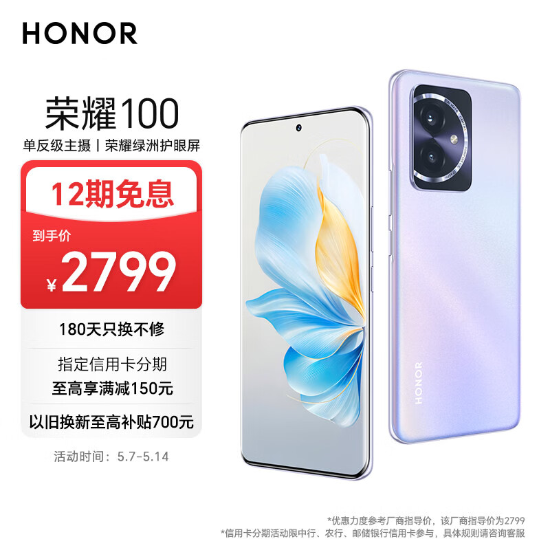 荣耀100 单反级主摄 荣耀绿洲护眼屏 第三代骁龙7 立体声双扬声器 AI手机 16+512 莫奈紫 5G价格:2799.00元!