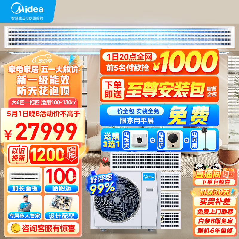 美的(Midea)中央空调一拖四风管机大6匹多联机星光全直流变频新一级能效智能冷暖清洁嵌入式隐形嵌系列MDS三代价格:28099.00元!