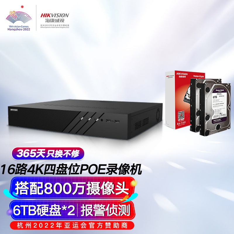 HIKVISION海康威视网络硬盘录像机监控16路POE网线供电满配16个摄像头带6T硬盘DS-7916N-R4/16P价格:5032.00元!