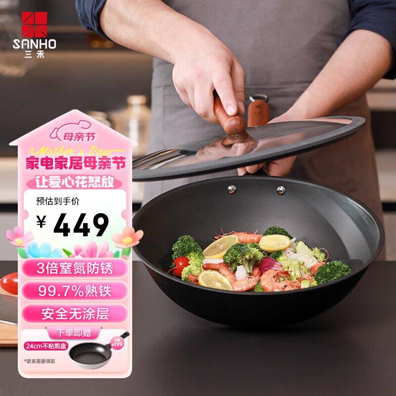三禾无涂层熟铁锅家用炒菜锅窒氮防锈不粘炒锅少油烟轻铁锅32cm价格:439.00元!