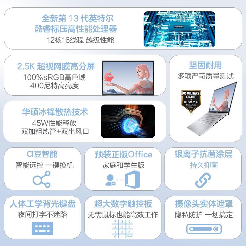 华硕潮色超能轻薄本 13代英特尔酷睿 14英寸高性能轻薄笔记本电脑 微醺薄荷 i5-13500H 16G 512G 2.5K屏价格:4299.00元!