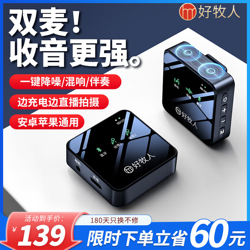 好牧人无线领夹麦克风抖音主播直播录音设备户外专业降噪短视频小蜜蜂收音麦K歌话筒手机电脑相机专用价格:139.00元!