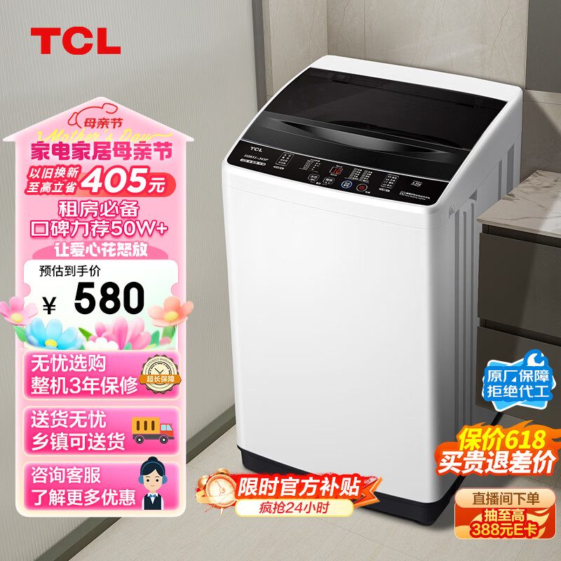 TCL 5.5KG全自动波轮洗衣机 宿舍租房神器 小型迷你洗衣机全自动家用 以旧换新 XQB55-36SP价格:579.00元!