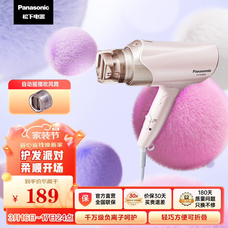 松下(Panasonic)电吹风机家用大功率高速大风力速干折叠便携家用 老婆女友吹发负离子护发风筒EH-WNE6B价格:189.00元!