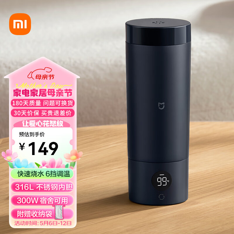 米家小米电热水杯加热杯热水壶 保温烧水杯 350ml迷你便携式旅行出差 智能恒温 316L不锈钢内胆 藏蓝色价格:147.00元!