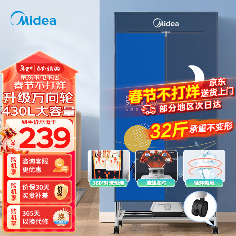 美的(Midea)烘干机家用 干衣机烘干衣柜 430L大容量快速烘干定时婴儿衣物烘衣机 风干机衣物护理机 HBG-JQ3价格:265.00元!