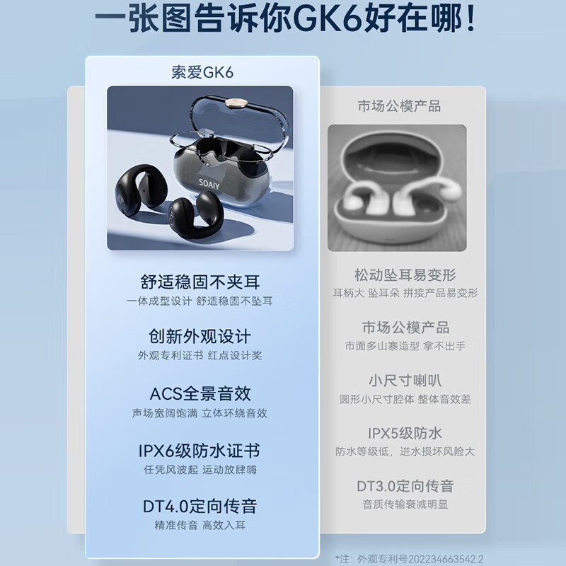 索爱(soaiy)GK6骨传导概念耳机真无线蓝牙开放不入耳耳夹式挂耳运动跑步骑行通话降噪适用苹果华为小米vivo白价格:199.00元!