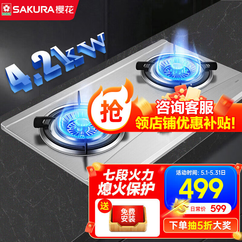 樱花(SAKURA)燃气灶双灶家用台式燃气灶天然气灶大火力液化气嵌入式煤气灶不锈钢灶易清洁一级能效 JZT-GBZ04【天然气】 燃气灶价格:440.00元!