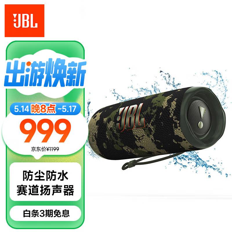 JBL FLIP6 音乐万花筒六代 便携蓝牙音箱 防水防尘 赛道扬声器 户外音响 独立高音单元 迷彩色价格:1199.00元!