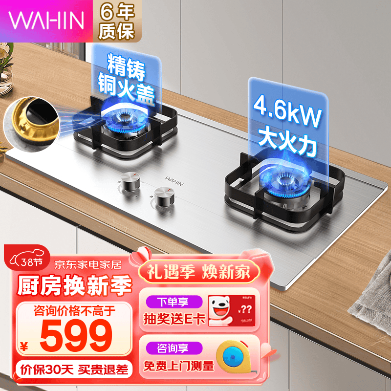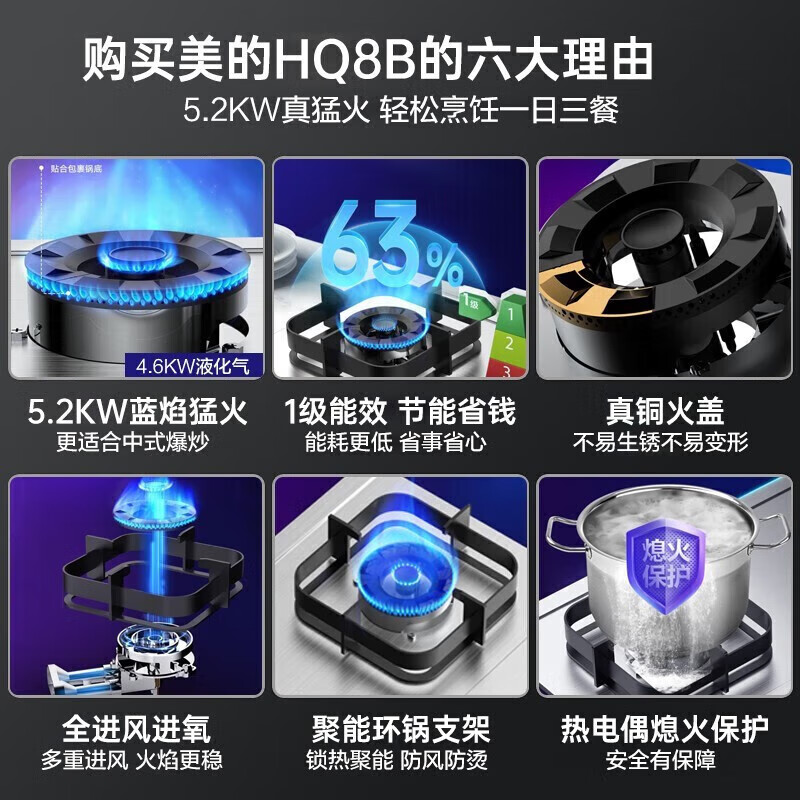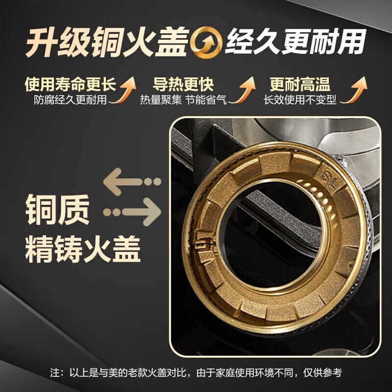 美的(Midea)出品铜火盖聚能灶5.2KW家用大火力燃气灶双灶天然气灶具HQ8煤气灶双灶台式嵌入式两用双眼灶猛火灶 (液化气灶4.6kw不锈钢灶) HQ6升级款美的WAHIN台嵌两用台灶价格:599.00元!