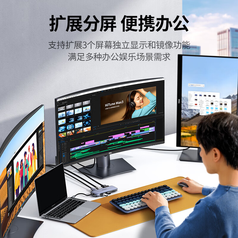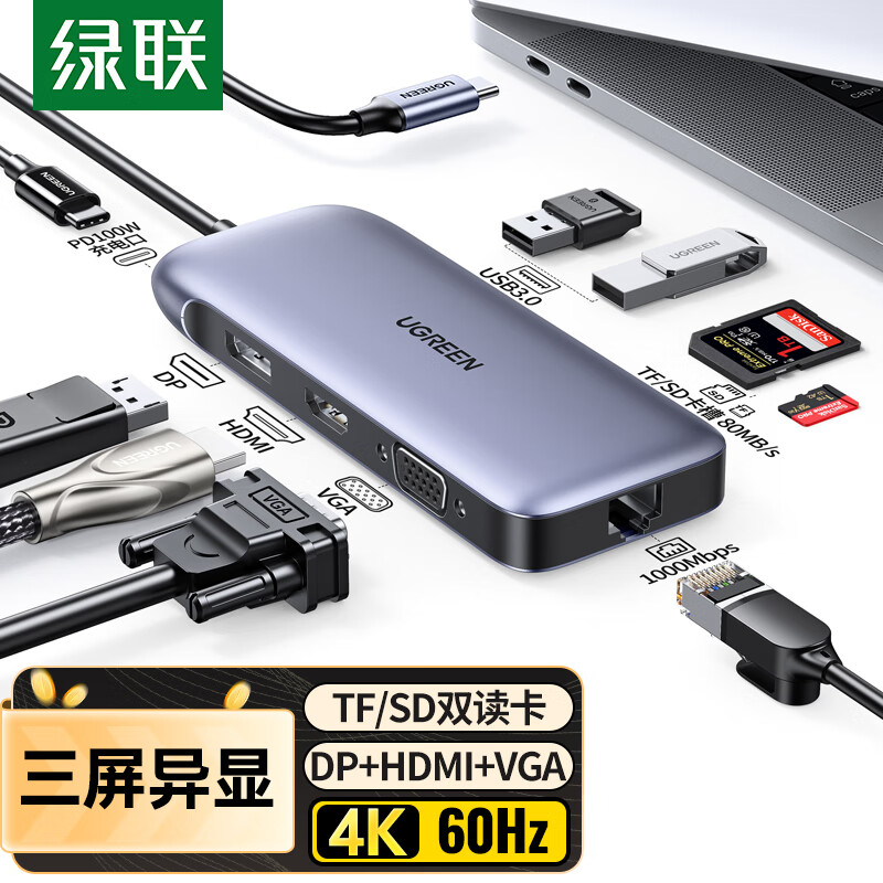 绿联Type-C扩展坞USB-C转DP雷电4拓展坞60Hz三屏异显HDMI投屏网线转接头读卡通用苹果15华为笔记本电脑价格:358.00元!