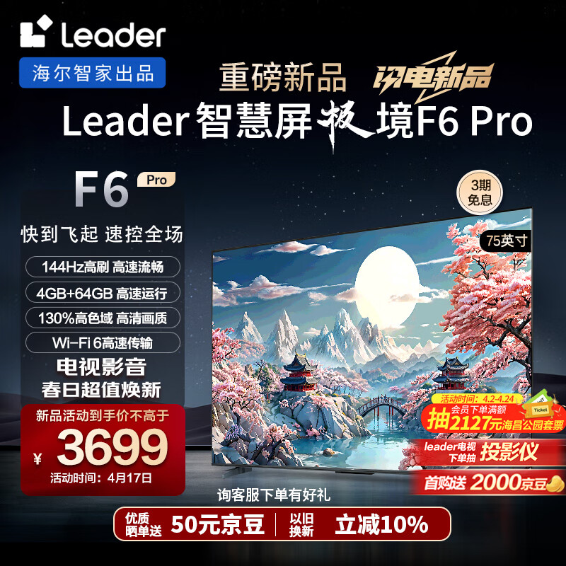 Leader海尔智家出品 L75F6 Pro 75英寸4K超高清电视144Hz高刷4+64G护眼平板电视机液晶智慧屏以旧换新价格:3699.00元!