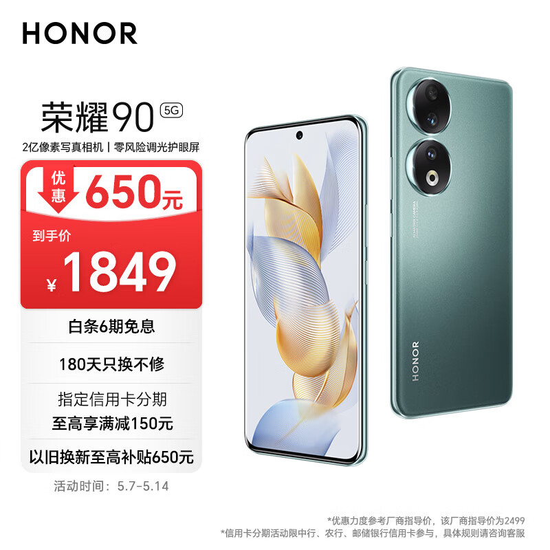 荣耀90 2亿像素超清相机 零风险调光护眼屏 5000mAh轻薄长续航 12GB+256GB 墨玉青 5G价格:1849.00元!
